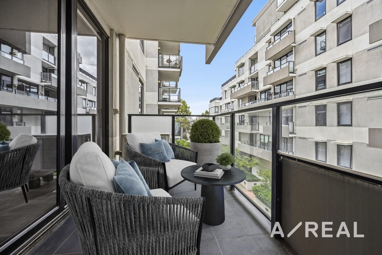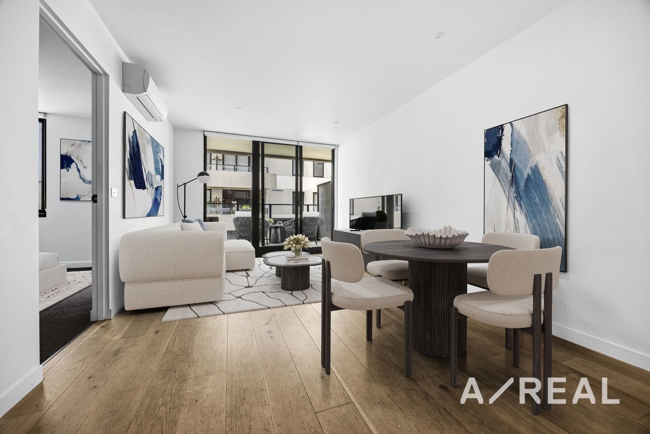 Beautifully light-filled and adorned with timber floors, the open-plan layout merges living/dining with a well-appointed, gourmet kitchen showcasing stone surfaces and quality appliances, before unfolding to a private balcony – creating a seamless indoor-outdoor flow. Appreciate the additional luxury of split system heating/AC, study nook, car space and storage cage.