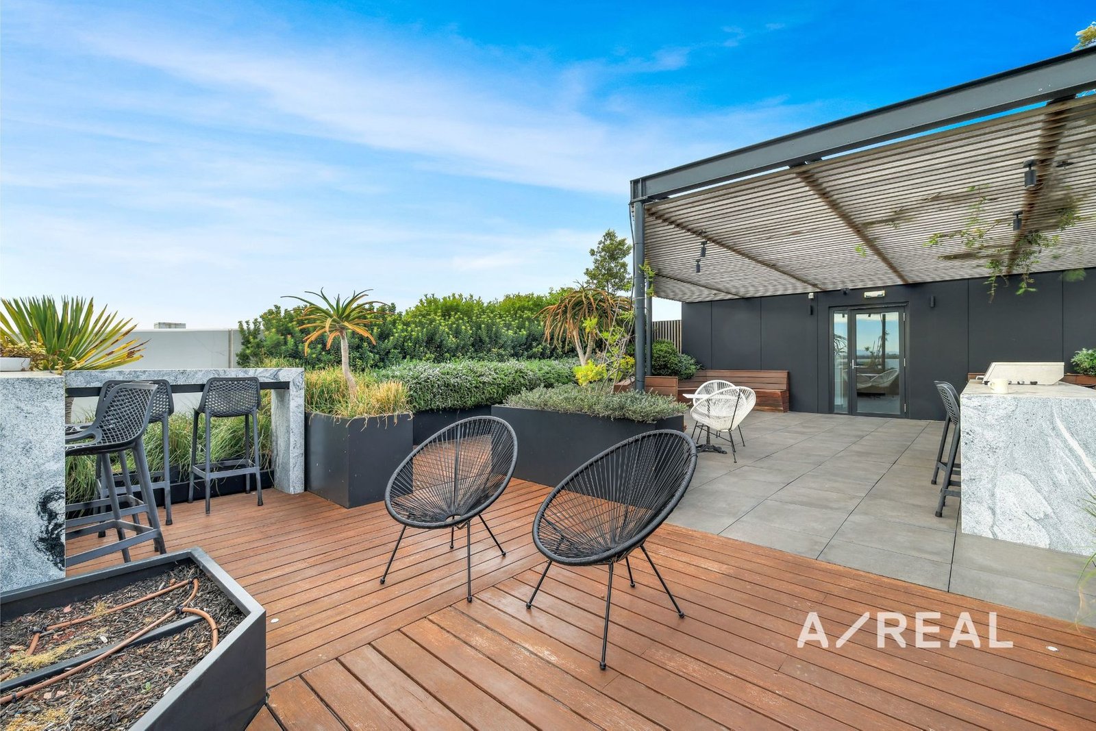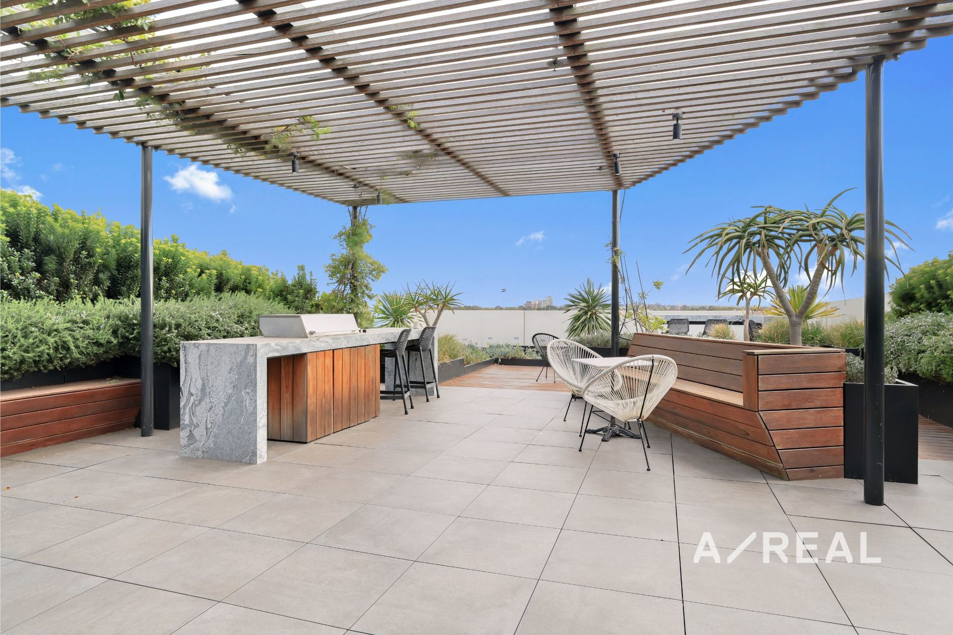 Timber floors and a neutral colour palette compliment the open-plan area, including a striking kitchen flaunting sleek stone surfaces, integrated fridge/freezer and Miele appliances. Luxury is further highlighted with a covered entertainer's balcony, split system heating/AC, basement car space, storage cage and serene roof-top garden with BBQ facilities - completing the perfect setting to relax or entertain.