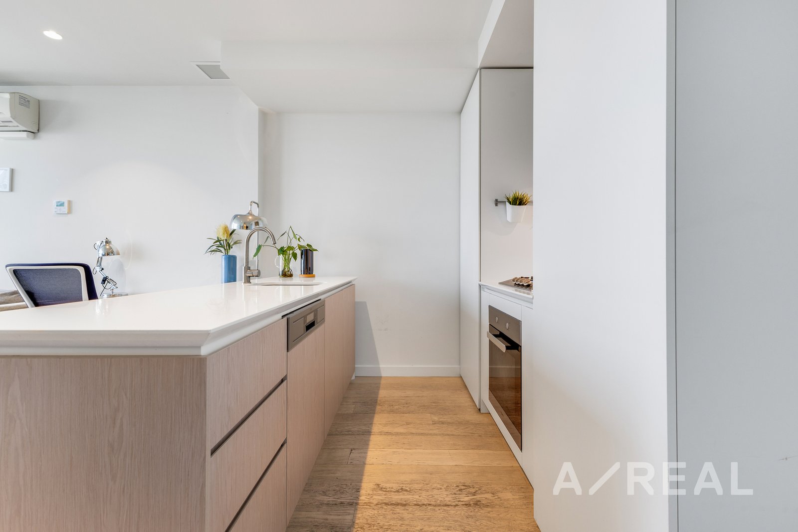Soft neutral tones, floor-to-ceiling windows and bespoke finishes exude sophistication in the open-plan living/dining area, complemented by a sleek stone-topped kitchen featuring stainless steel appliances, split system heating/AC, secure intercom entry and balcony.