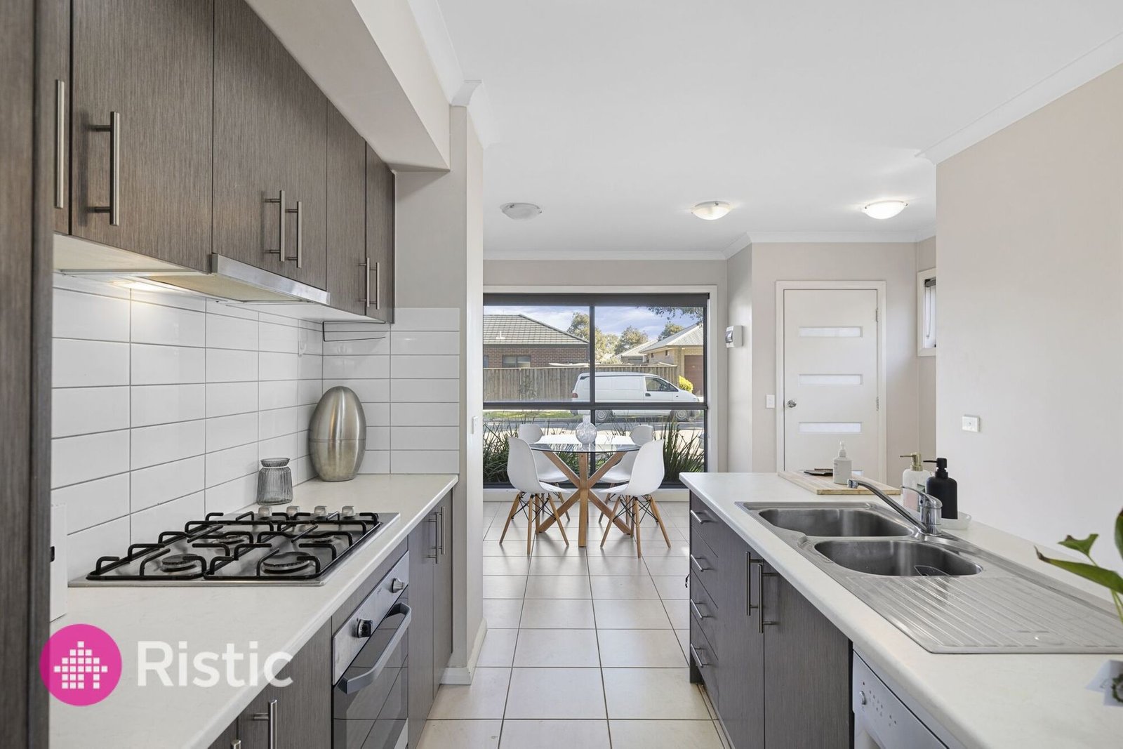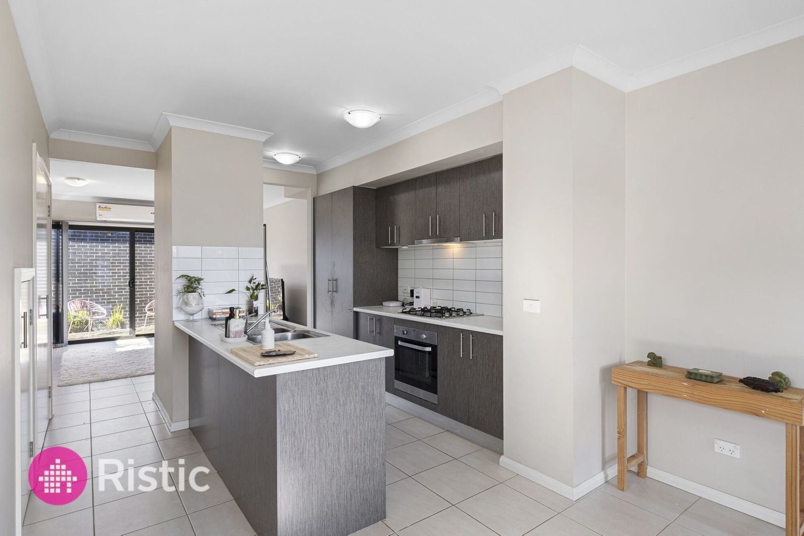 Step into a spacious open plan living, dining and kitchen zone framed by high ceilings and tiled floors. The kitchen showcases laminate benches with an island, double sink, dishwasher, 600 mm gas cooktop and oven, and a tiled splashbackready for everyday living or relaxed entertaining. Sliding glass doors extend the space out to a private concrete patio, with secure rear gate access and a detached, remote-controlled single garage.