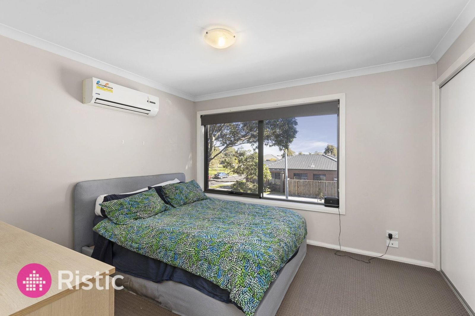 Upstairs, the master bedroom is carpeted and equipped with a built-in robe, split-system comfort, and a private ensuite. The second bedroom also offers a built-in robe and wall heater, with the main bathroom just steps away. A smart Euro laundry completes the layout.