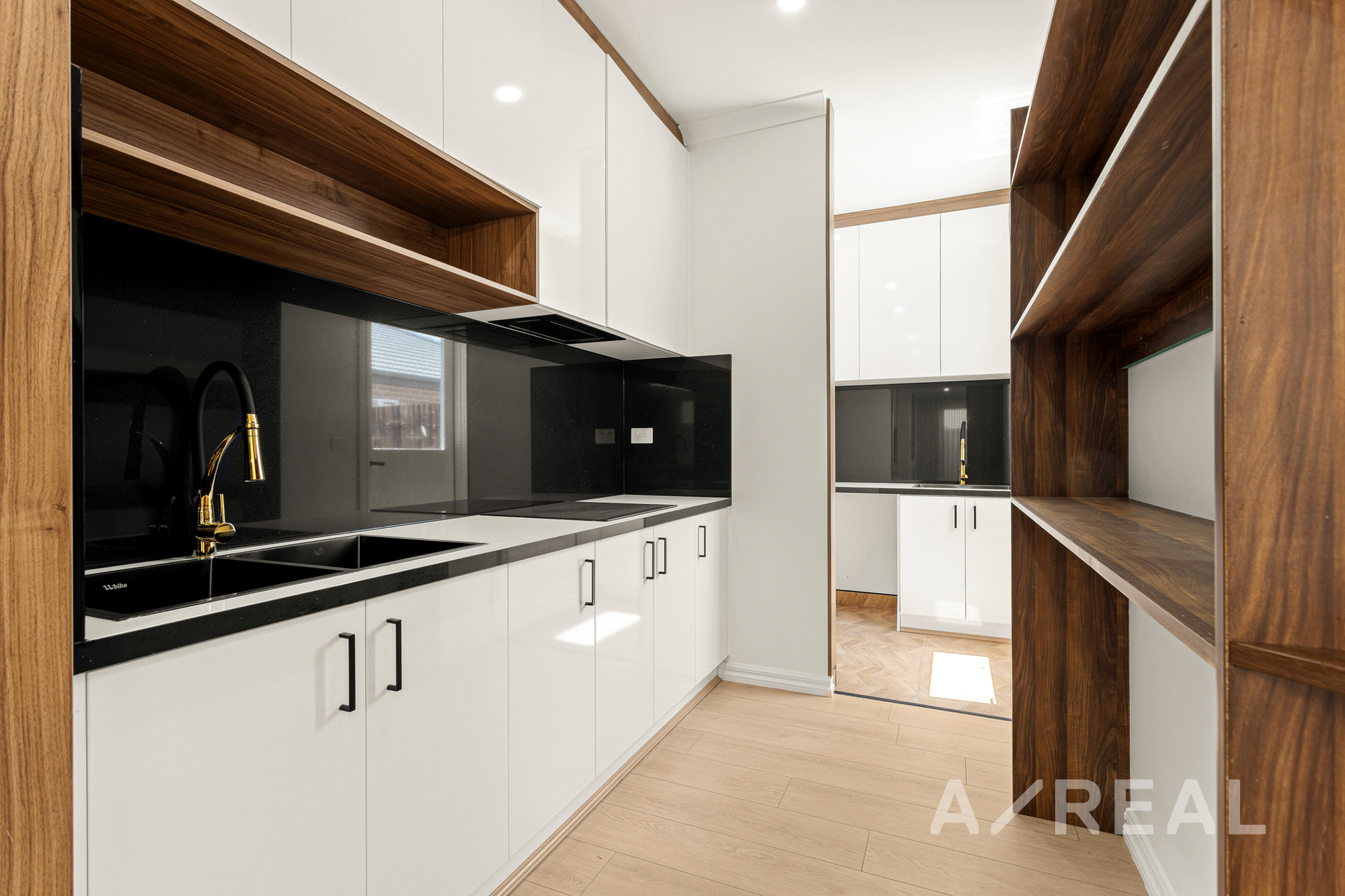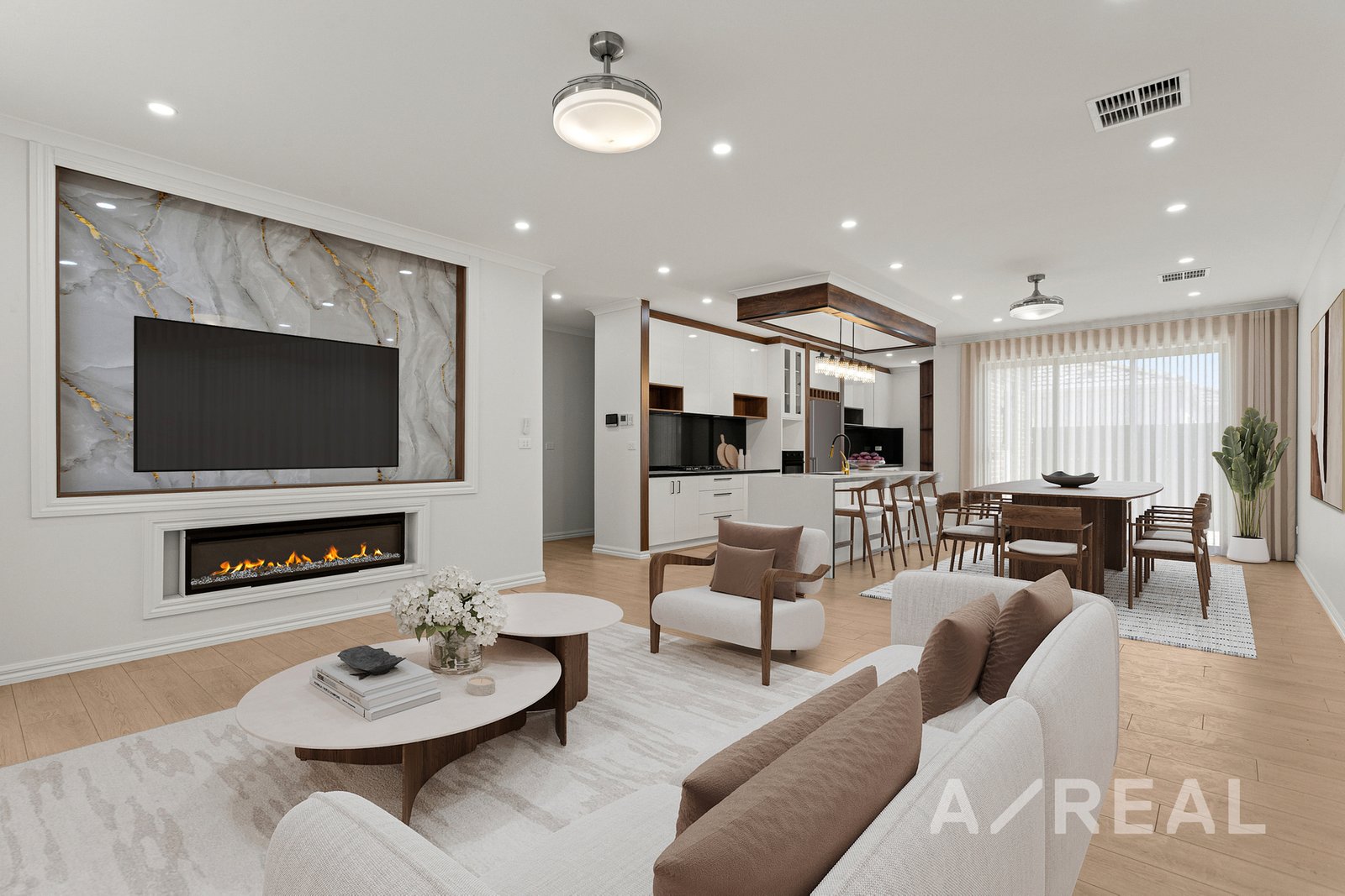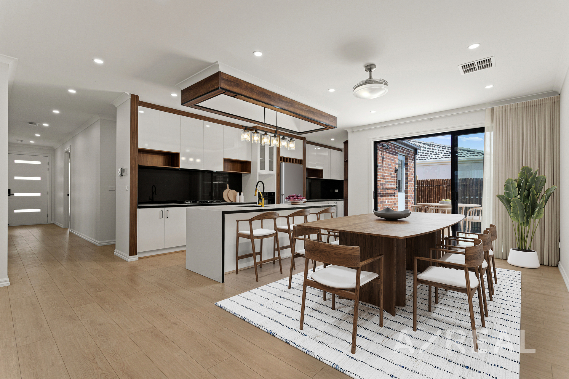 The heart of the home is the expansive open-plan kitchen, dining, and living area-an inviting space ideal for both relaxed daily living and entertaining. The stylish kitchen is equipped with quality appliances, a butler's pantry with an induction cooktop, and generous bench space, offering both practicality and elegance. Large windows flood the space with natural light, while ceiling fans with integrated lighting and zoned refrigerated heating and cooling ensure year-round comfort. Sliding doors extend the living area to a private outdoor terrace, perfect for alfresco dining or weekend gatherings in a low-maintenance setting.