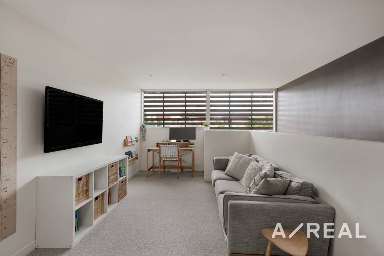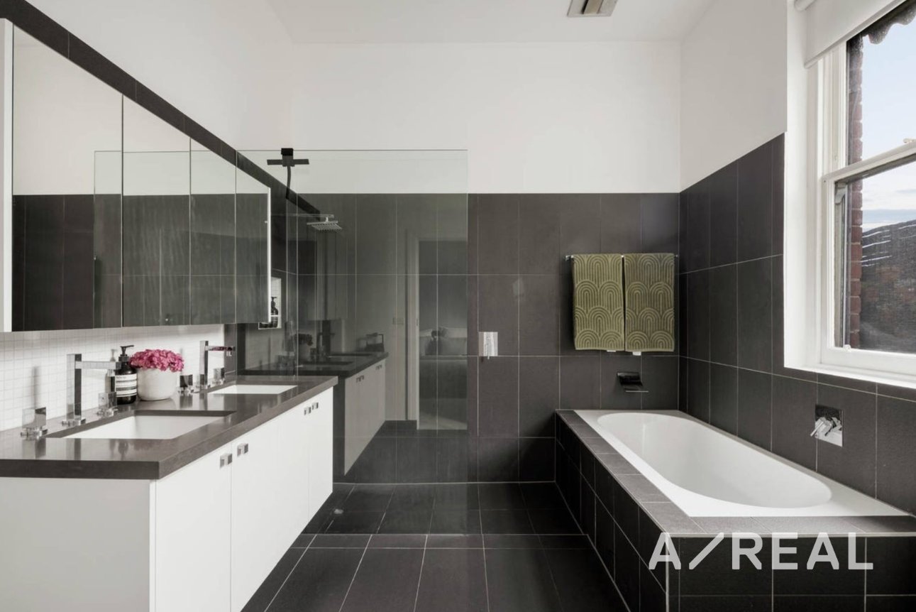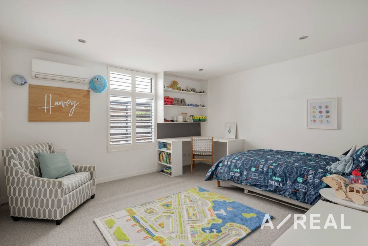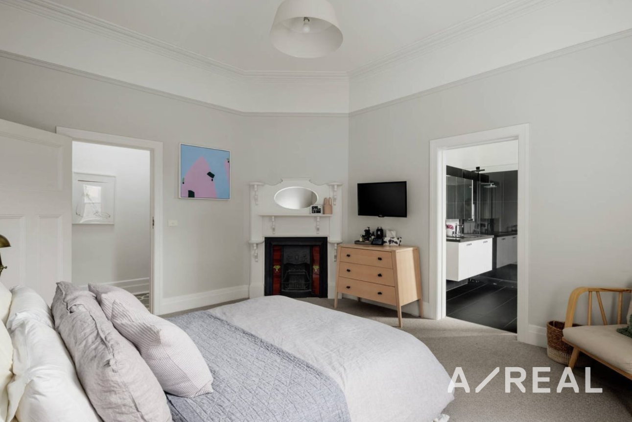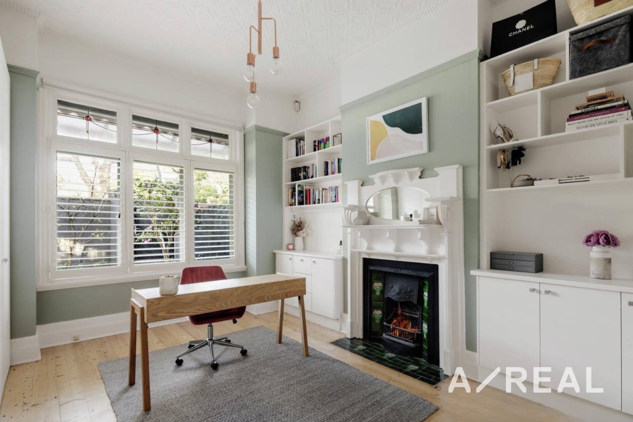 The accommodation comprises three bedrooms with built-in robes and study desks, including a luxurious main bedroom with ensuite, separate bathtub, walk-in robe and original open fireplace, as well as a teenage retreat and a flexible home office or fourth bedroom. A central bathroom, two additional powder rooms, a large separate laundry and an abundance of storage further enhance the home’s functionality.