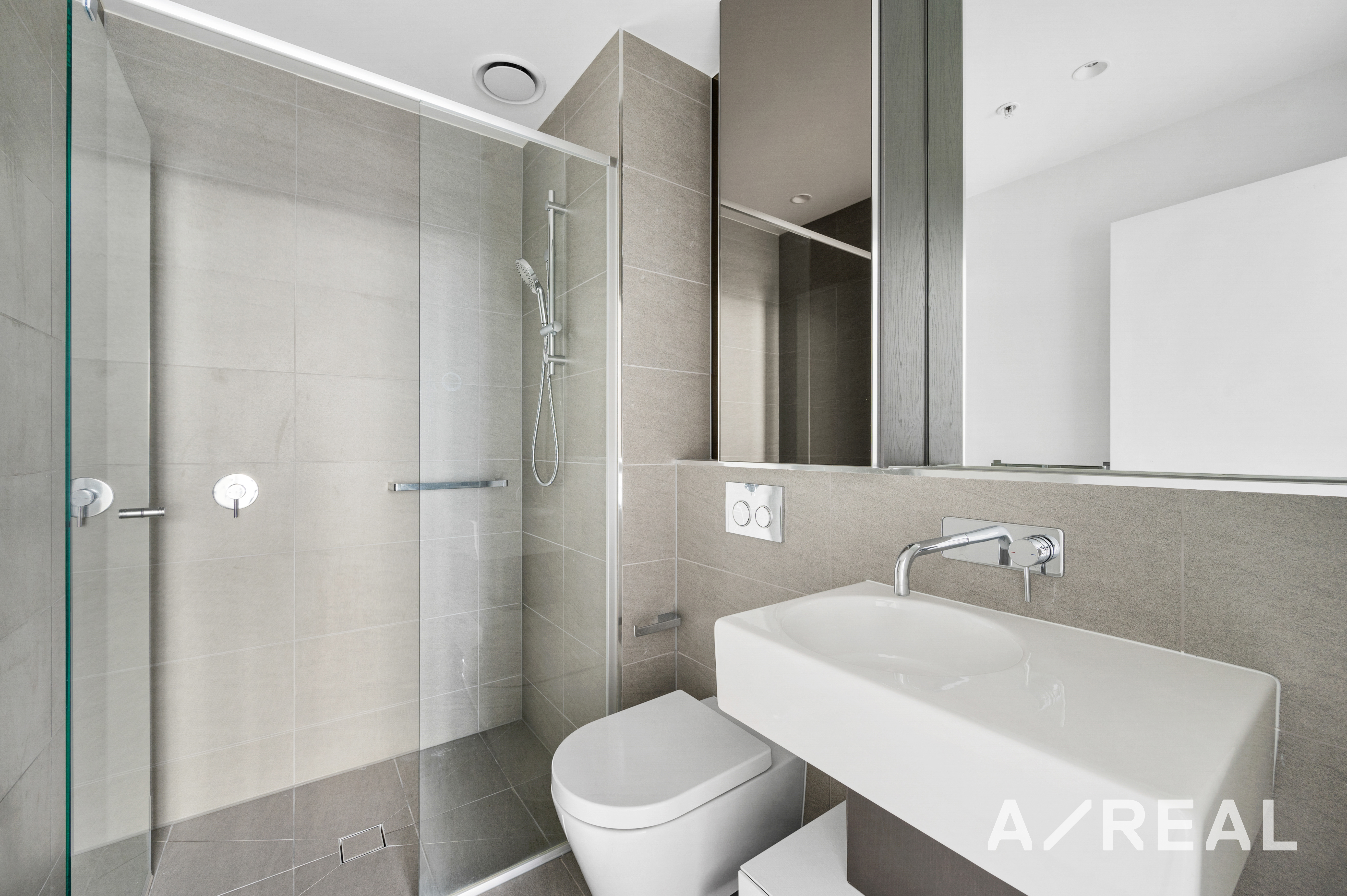 Open plan kitchen, featuring European appliances including gas cooktop, dishwasher, integrated fridge, an abundance of pantry space, timber floors, and luxury carpet for bedrooms. Quality appointed bathroom, tiled floor-to-ceiling with a walk-in shower and mirrored cabinets above the stone vanities. Being Sky Residence, the apartment also includes a combo washer/dryer for added convenience.