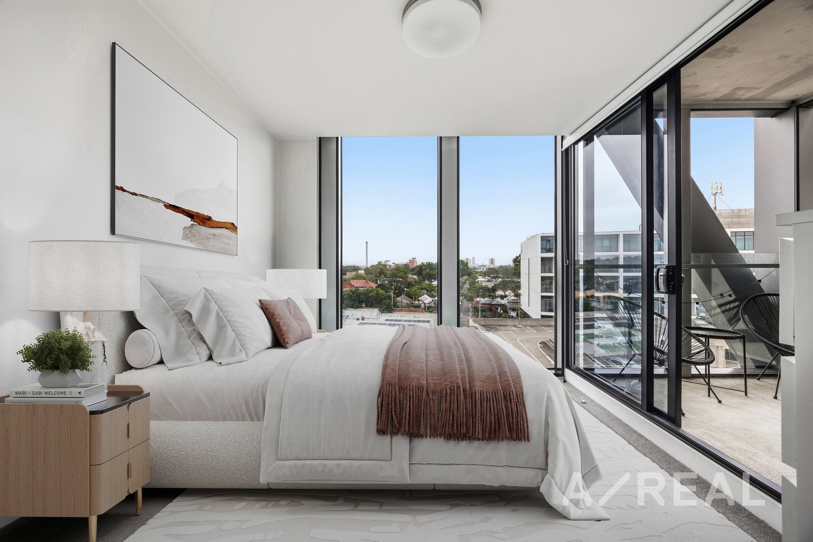This designer apartment offers an elevated inner-city lifestyle with abundant natural light, sweeping views, and everyday practicality. Full-height glazing frames the outlook and the open-plan living and dining area, while a generous covered balcony creates an outdoor extension for relaxing against a panoramic skyline backdrop.