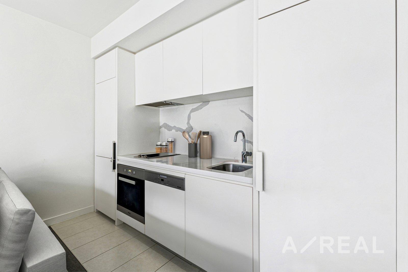 Inside, the apartment is refined, low-maintenance and filled with natural light. Full-height glazing frames the open-plan living and dining domain, while the enclosed balcony provides a flexible all-weather retreat space. The kitchen is highly functional, appointed with premium Miele appliances, ample preparation space and generous storage, making day-to-day living as easy as entertaining at home. Heating and cooling keep the interior comfortable through every season, while an internal laundry adds another layer of practical appeal.