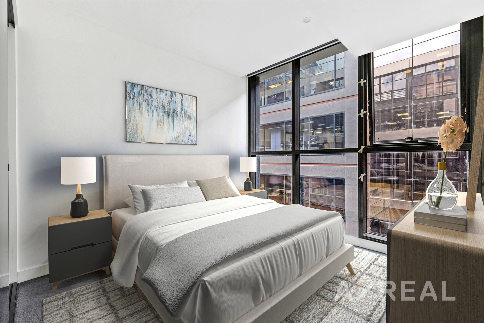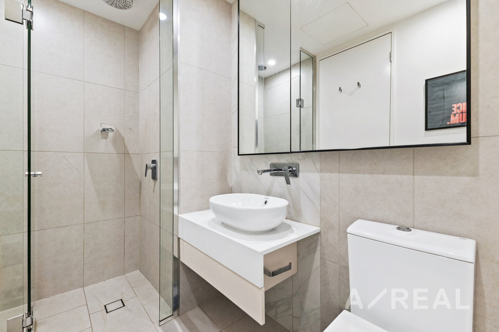 The bedroom is generously scaled, with mirrored built-in robes designed for easy living. A central bathroom, finished with clean lines and quality fittings, complements the apartment's cohesive, contemporary feel. Every detail has been resolved for comfort and a strong sense of urban sophistication.
