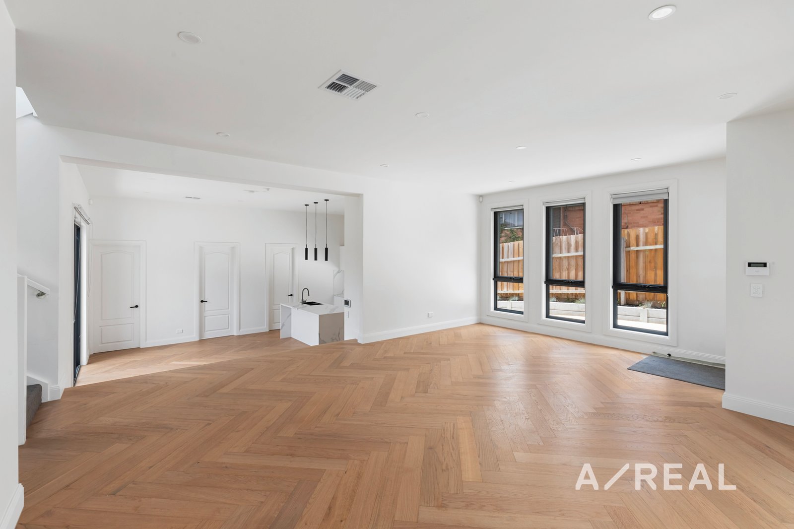 Inside, the home showcases elegant French-inspired design, featuring herringbone timber flooring, high ceilings, and a light-filled open-plan living and dining area. The gourmet kitchen is equipped with premium Miele appliances, a 40mm stone benchtop, custom cabinetry, and a butler’s pantry—perfect for both everyday living and entertaining.