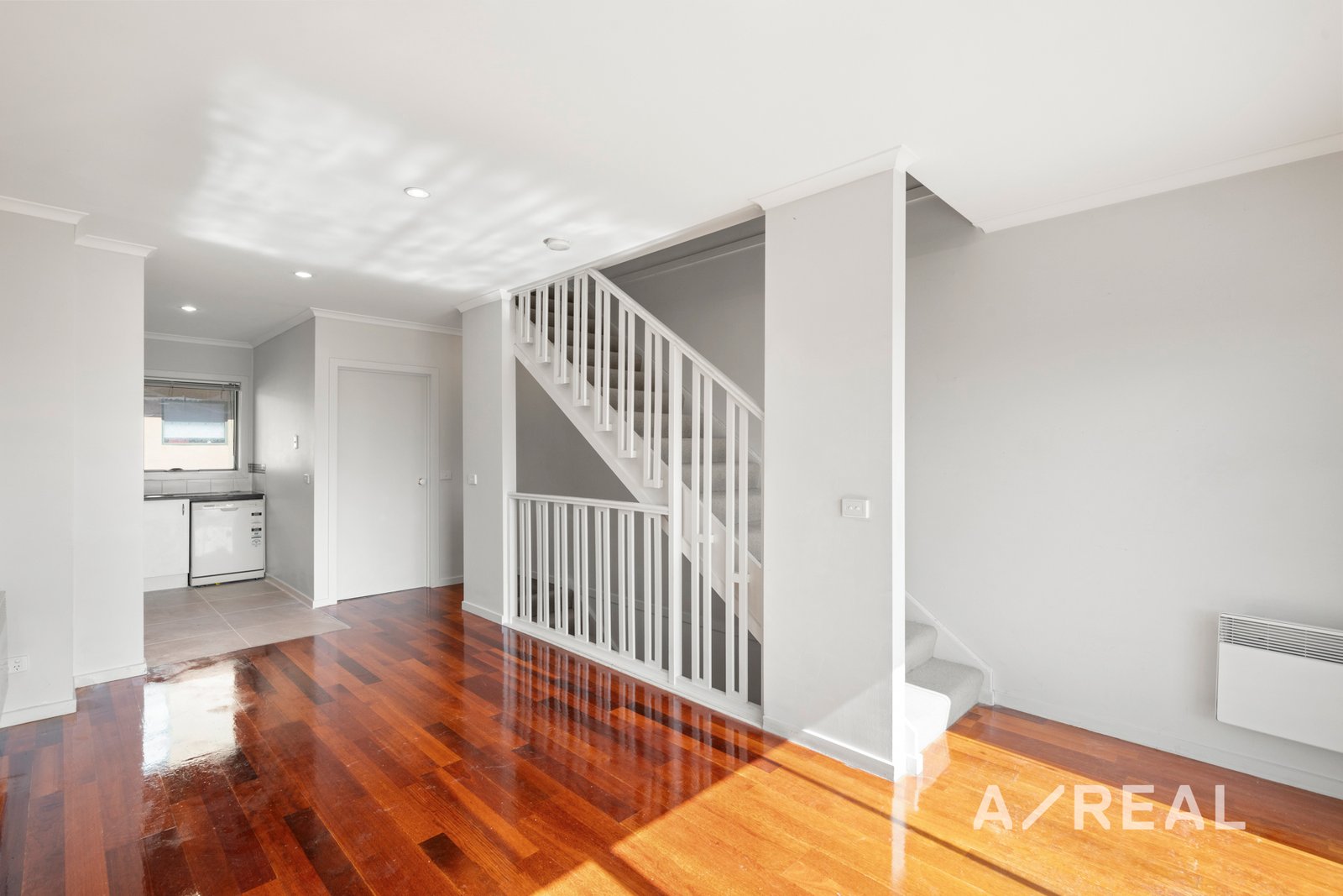 Featuring two well-sized bedrooms, both with built-in robes, the home is complemented by polished timber flooring throughout, creating a warm and contemporary feel. The central bathroom services the upper level, while an additional separate WC located near the laundry provides added practicality for everyday living and guests.