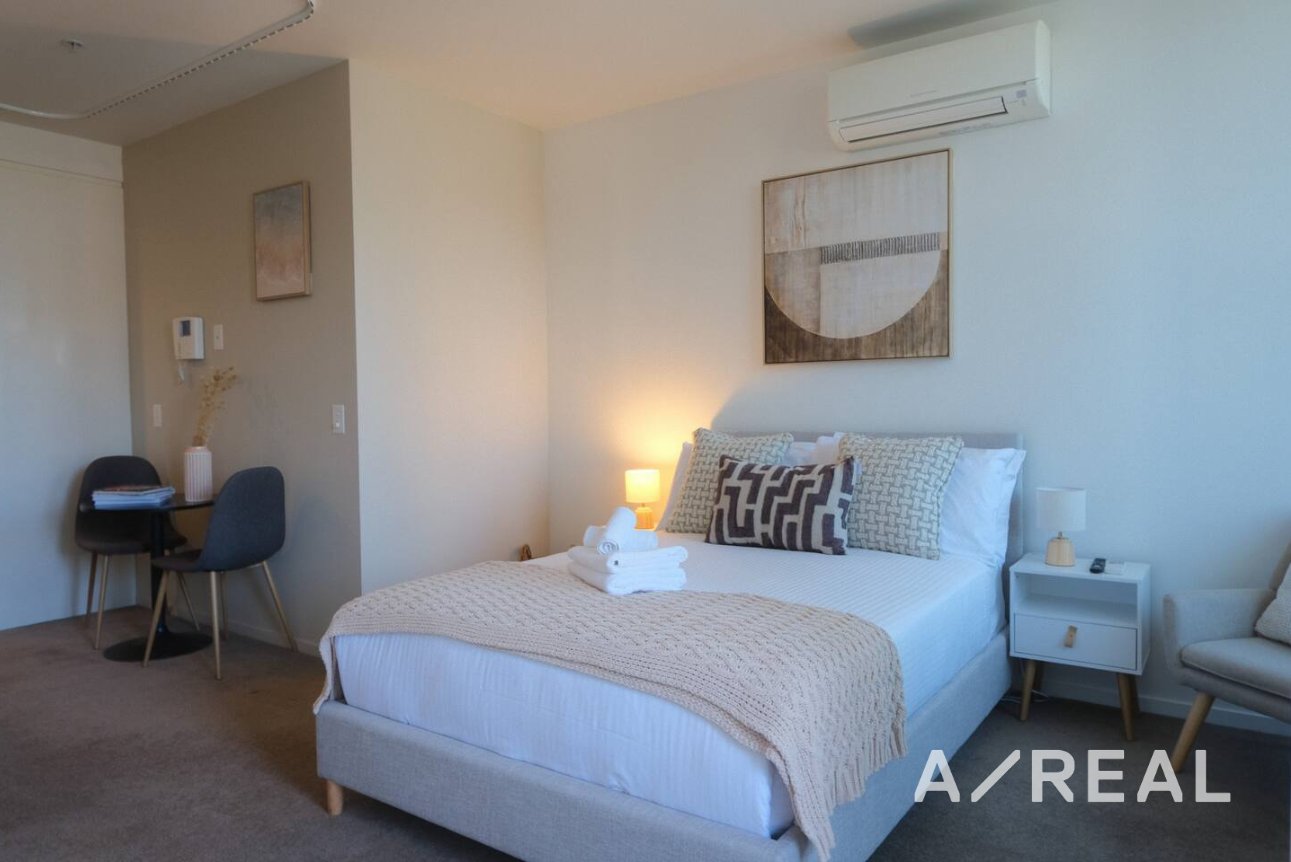 The bedroom is generously sized with built-in bed, complemented by a modern bathroom featuring quality fittings and a clean, sophisticated design. Additional features include split-system heating and cooling, secure building access, and access to resident amenities, offering both convenience and peace of mind.